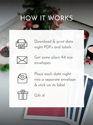Place an order, download the PDFs, print them out and follow the instructions. That's it - instant date night fun!